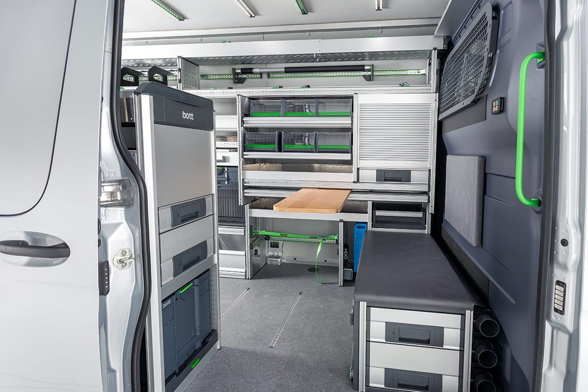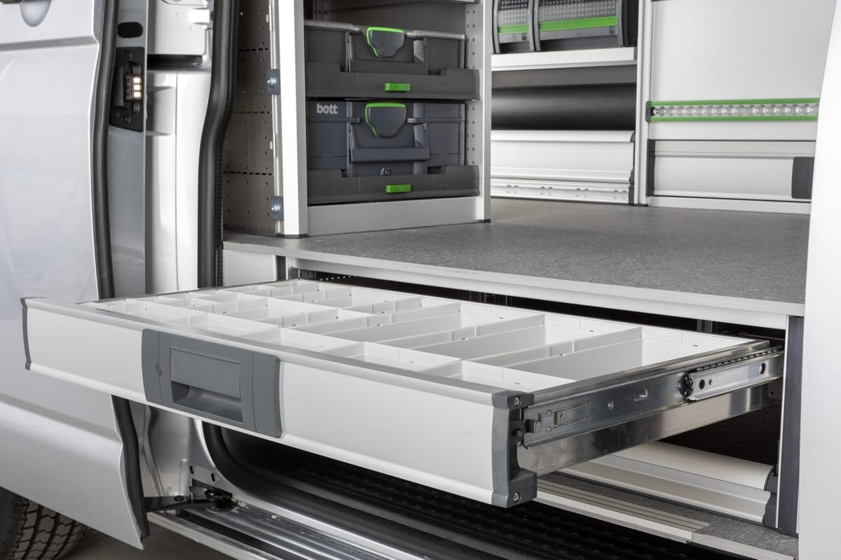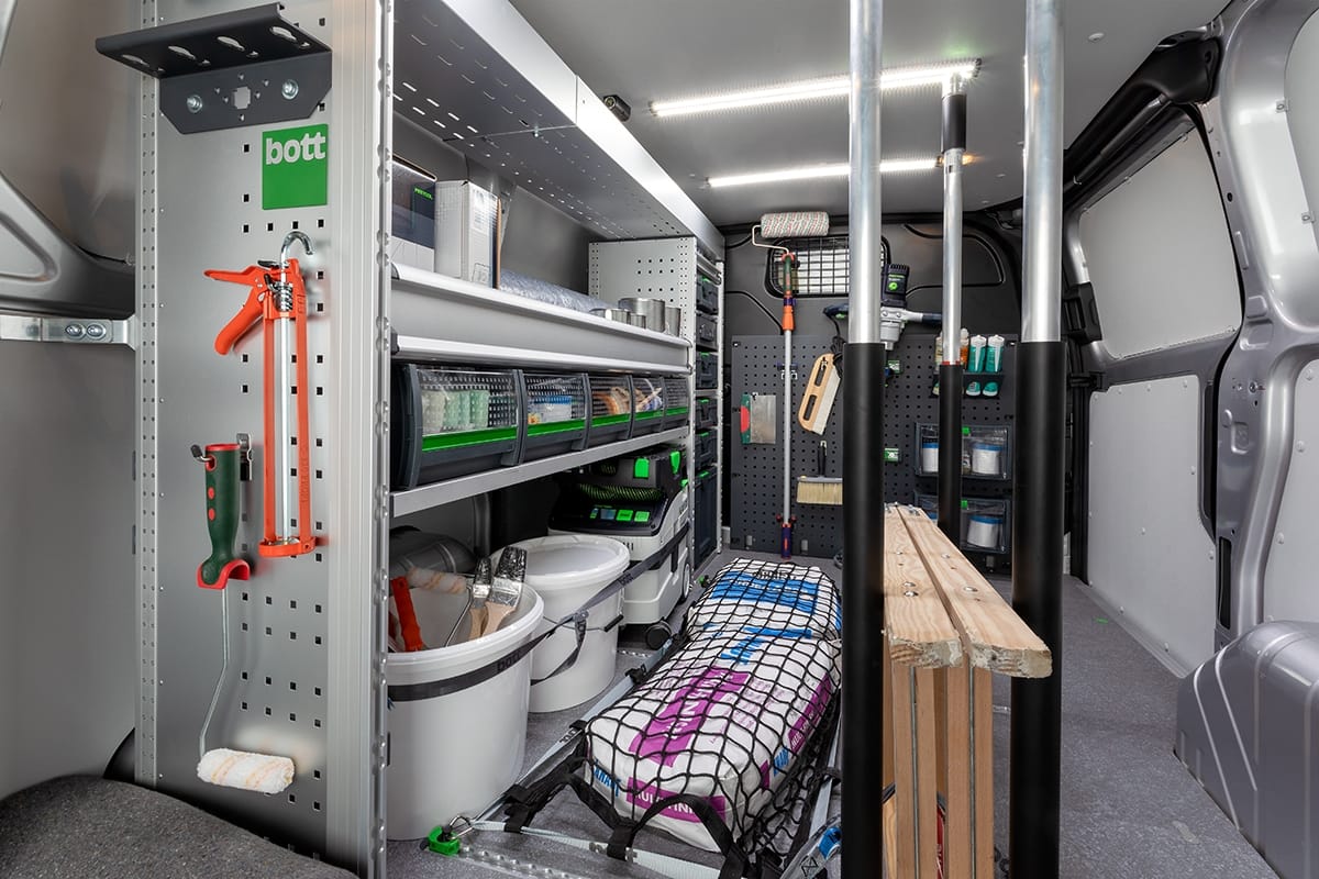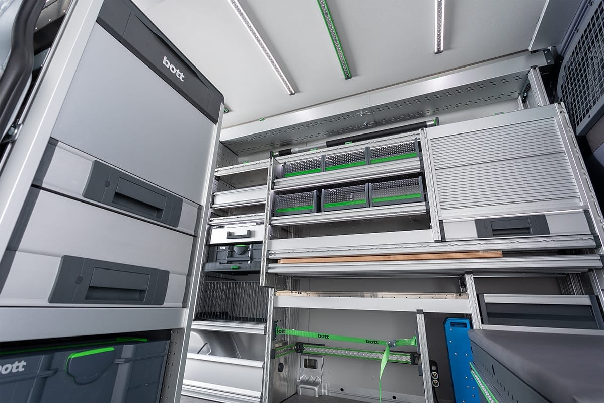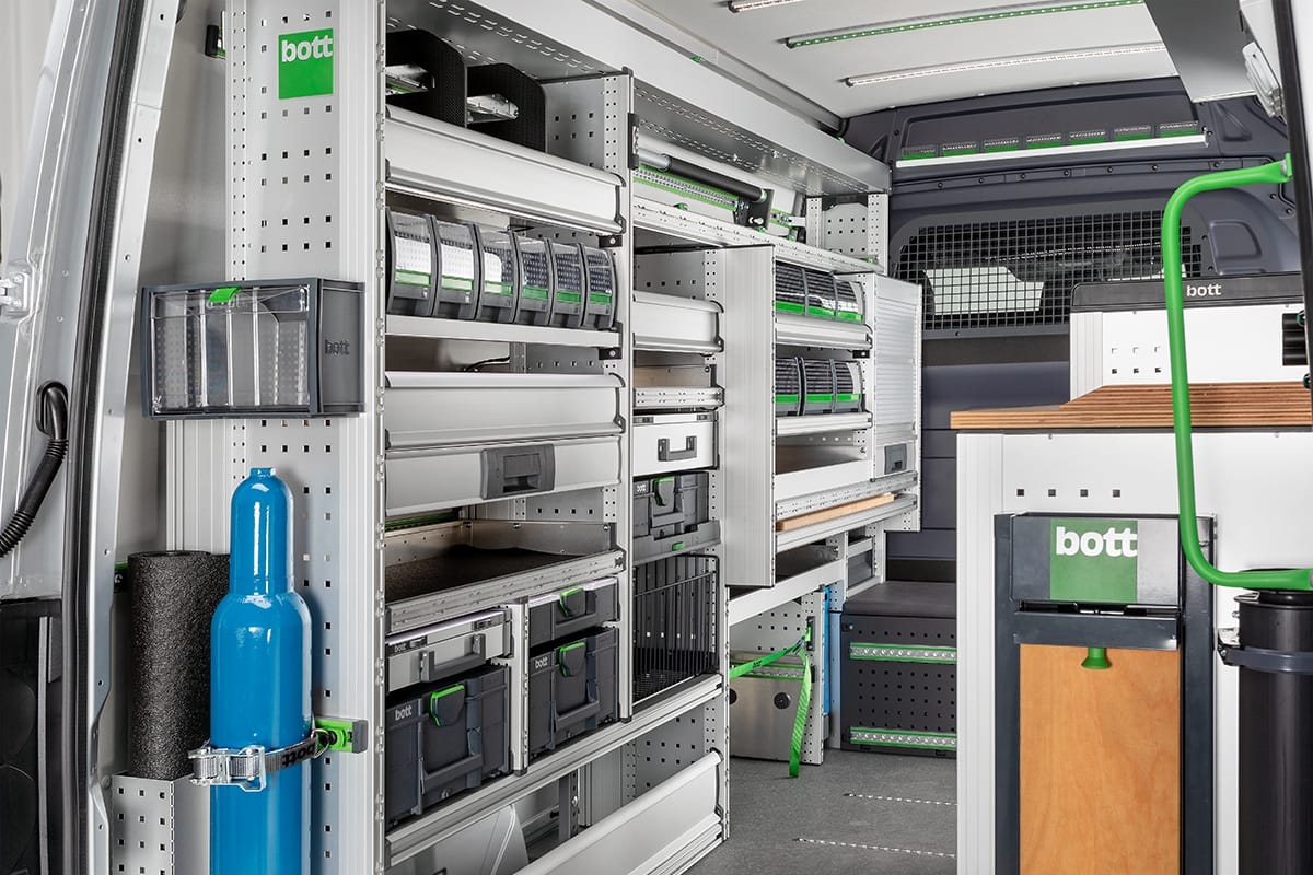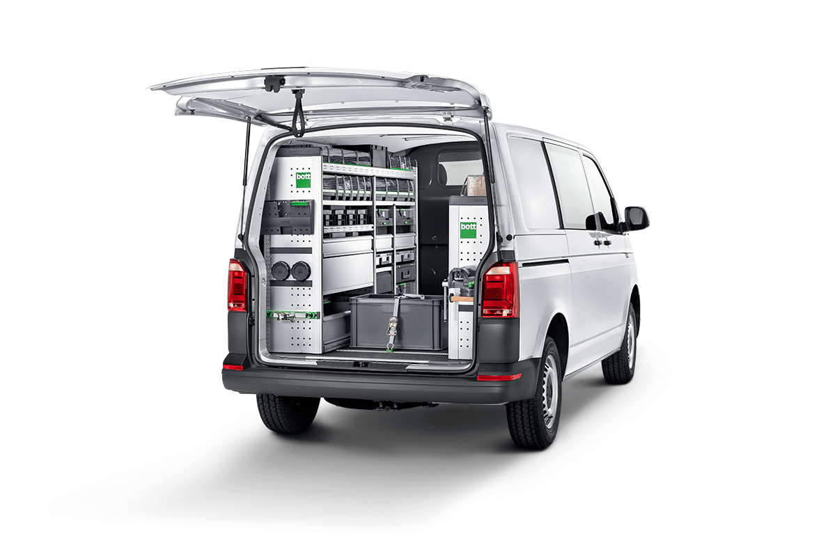 Branchengerecht für höchste Effizienz: Passen Sie Ihr Fahrzeug an Ihre Bedürfnisse an, verwandeln Sie es in eine mobile Werkstatt. Arbeiten Sie und Ihre Mitarbeiter wirtschaftlich, professionell und sicher, mit einer Fahrzeugeinrichtung von bott.